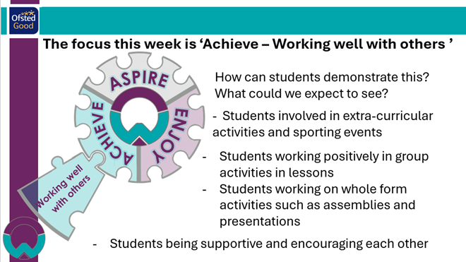 As a school; we are alive with learning, ensuring everyone continually improves to be the best they can while developing individual interests and talents. We aim for all our young people to further gain in confidence and ASPIRE to make the best progress in all they do within a safe, caring and supportive environment. Our school has high expectations and high levels of achievement and ensures ENJOYMENT is at the heart of all our work.